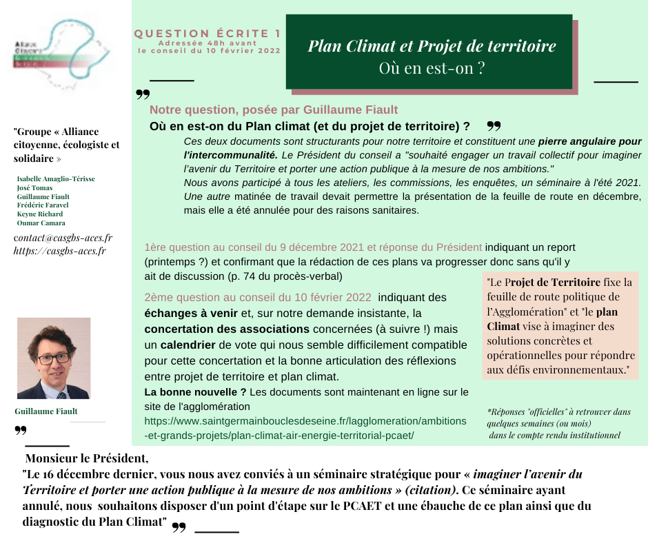 De report en report, les documents se construisent sans véritable ni suffisante concertation. Les réponses qui nous sont apportées nous préoccupent alors qu’il s’agit d’un sujet majeur pour notre territoire. Retrouvez notre question, les enjeux etc. juste en-dessous (et les premiers documents mis en ligne sur le site de l’intercommunalité le jour de ce conseil là).