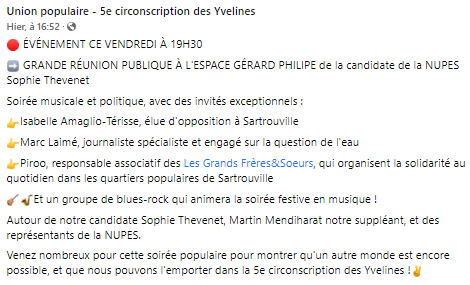 Dimanche soir, je félicitais Sophie et Martin pour leur excellent score ( Union populaire – 5e circonscription des Yvelines) et je mentionnais que la gauche pouvait encore faire mieux au 2e tour.