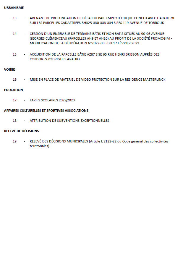 Toujours peu de sujets, l’essentiel étant cette fois-ci consacré au budget avec les comptes de 2021 et des crédits/opérations reportés sur 2022 soit un budget supplémentaire de 17,5 M€. Quelques subventions exceptionnelles, un peu d’urbanisme, du matériel de vidéo protection sur la résidence Maeterlinck et les tarifs scolaires (toujours sans quotient familial) et ce sera tout…
