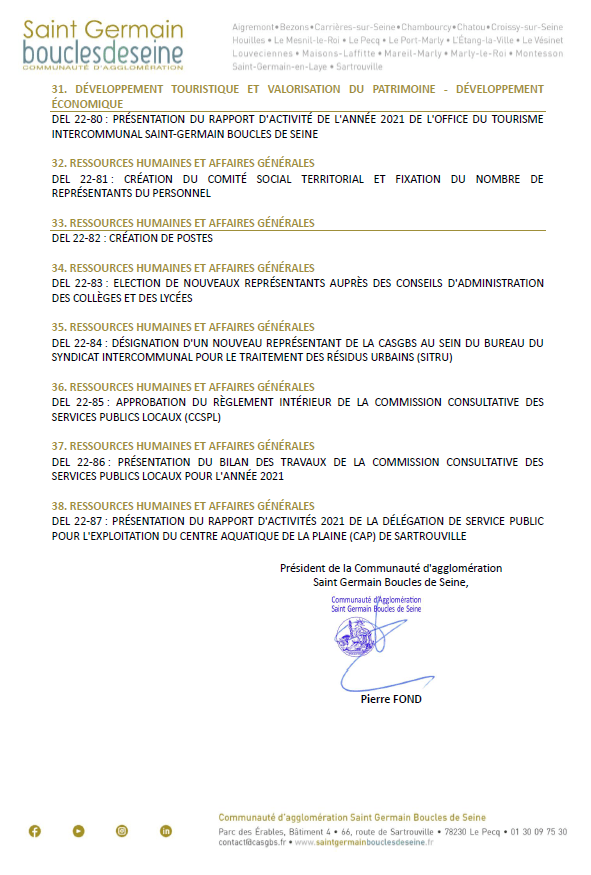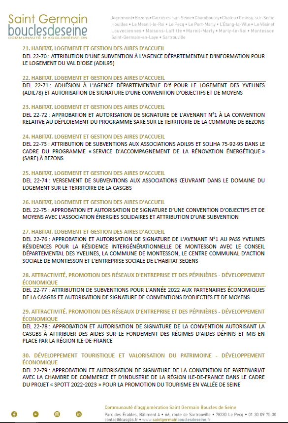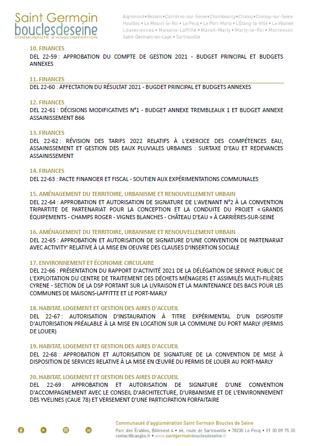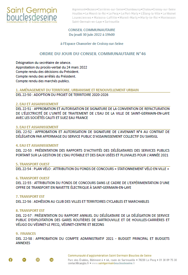 Prochain conseil communautaire : jeudi 30 juin 2022 (19h00, Espace Chanorier, Croissy-sur-Seine), voici les principaux sujets à l’ordre du jour :