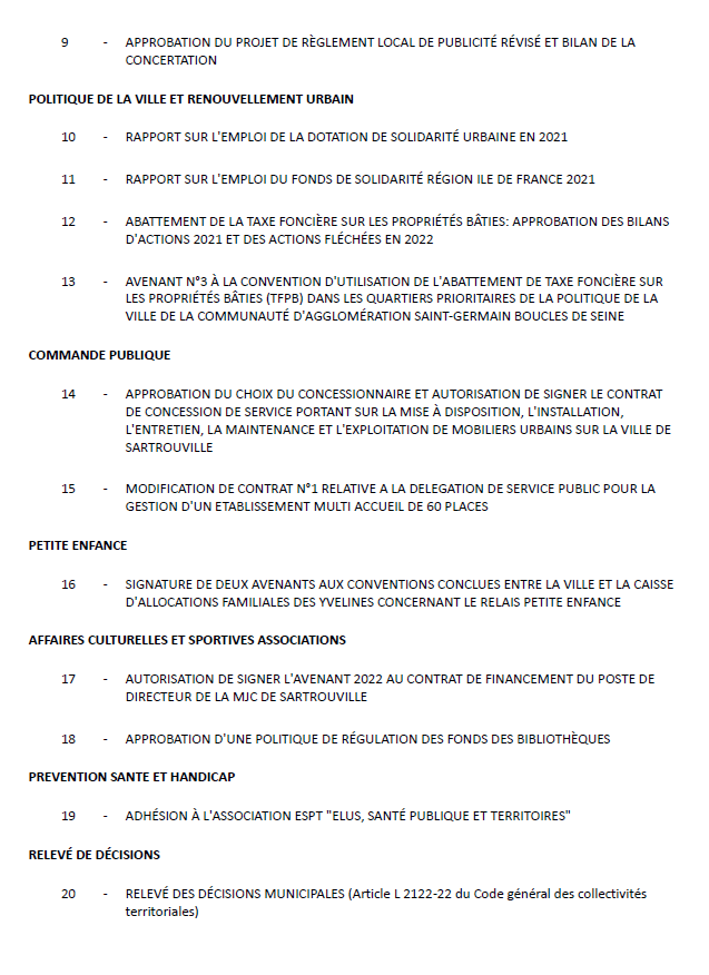 A noter également l’approbation du choix du concessionnaire pour la mise à disposition, l’installation, l’entretien, la maintenance et l’exploitation de mobiliers urbains sur la ville