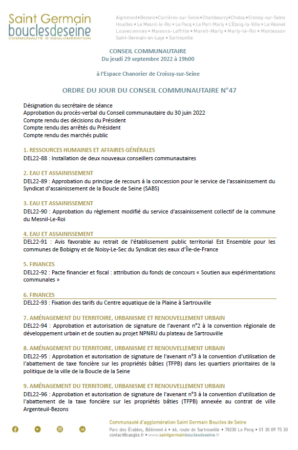 Prochain conseil communautaire : jeudi 29 septembre 2022 (19h00, Espace Chanorier, Croissy-sur-Seine), voici les principaux sujets à l’ordre du jour :