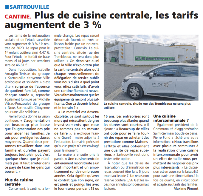 Nous avons découvert la fermeture de la cantine centrale de Sartrouville au détour d’une délibération lors du dernier conseil municipal (+ ici) : les repas sont donc totalement sous-traités à une entreprise privée, fabriqués ailleurs et livrés (on aurait aimé l’apprendre différemment et pouvoir en discuter) et que va devenir la cuisine elle-même (bâtiment et terrain) ? Mystère, on aura juste appris qu’il y a un projet de cuisine intercommunale, c’est le seul point qui pourrait être positif dans cette situation très opaque qui nous place, une nouvelle fois, devant le fait accompli.