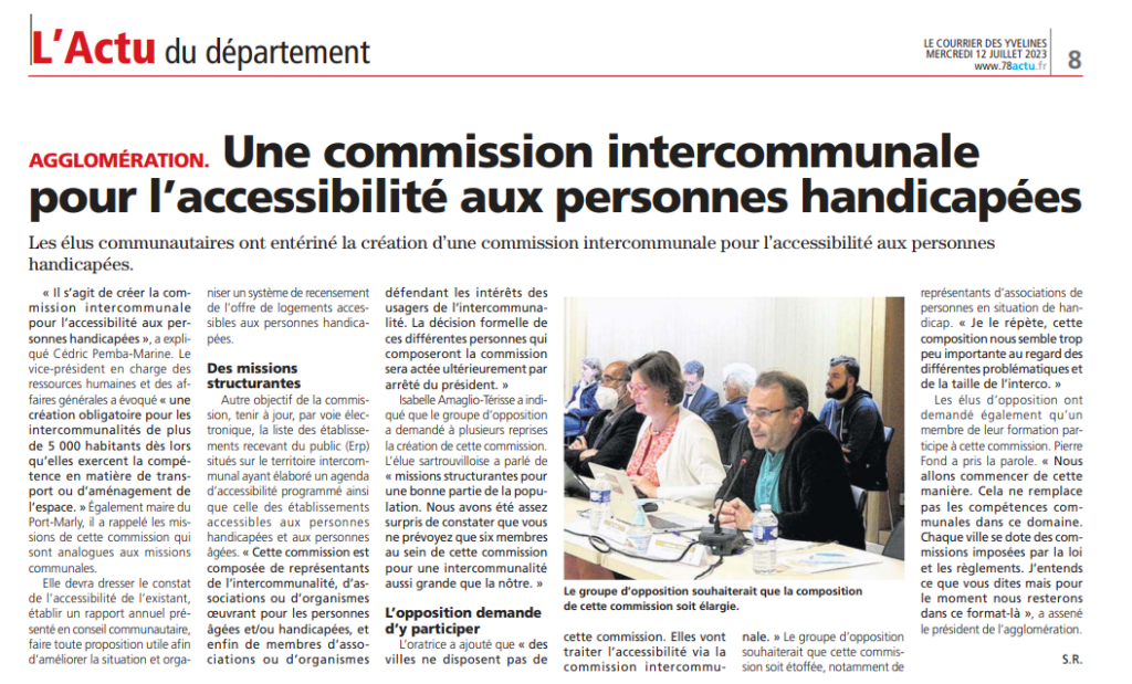 Pas de nouvelles depuis sa création en mars dernier et pas de nouvelles de son articulation avec les communes notamment à Sartrouville et malgré nos demandes. Il ne s’agit pourtant pas simplement de se mettre en conformité mais d’envisager une réelle politique en faveur de l’accessibilité et du handicap.