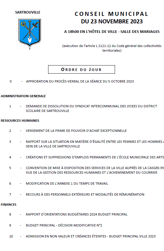 Le prochain conseil de rentrée se tient jeudi 23 novembre, 18h00, salle des mariages à la mairie. A l’ordre du jour : les orientations budgétaires pour 2024, la politique d’égalité hommes-femmes menée par la mairie, des mesures techniques internes et quelques dossiers d’urbanisme (Avenue Berteaux).