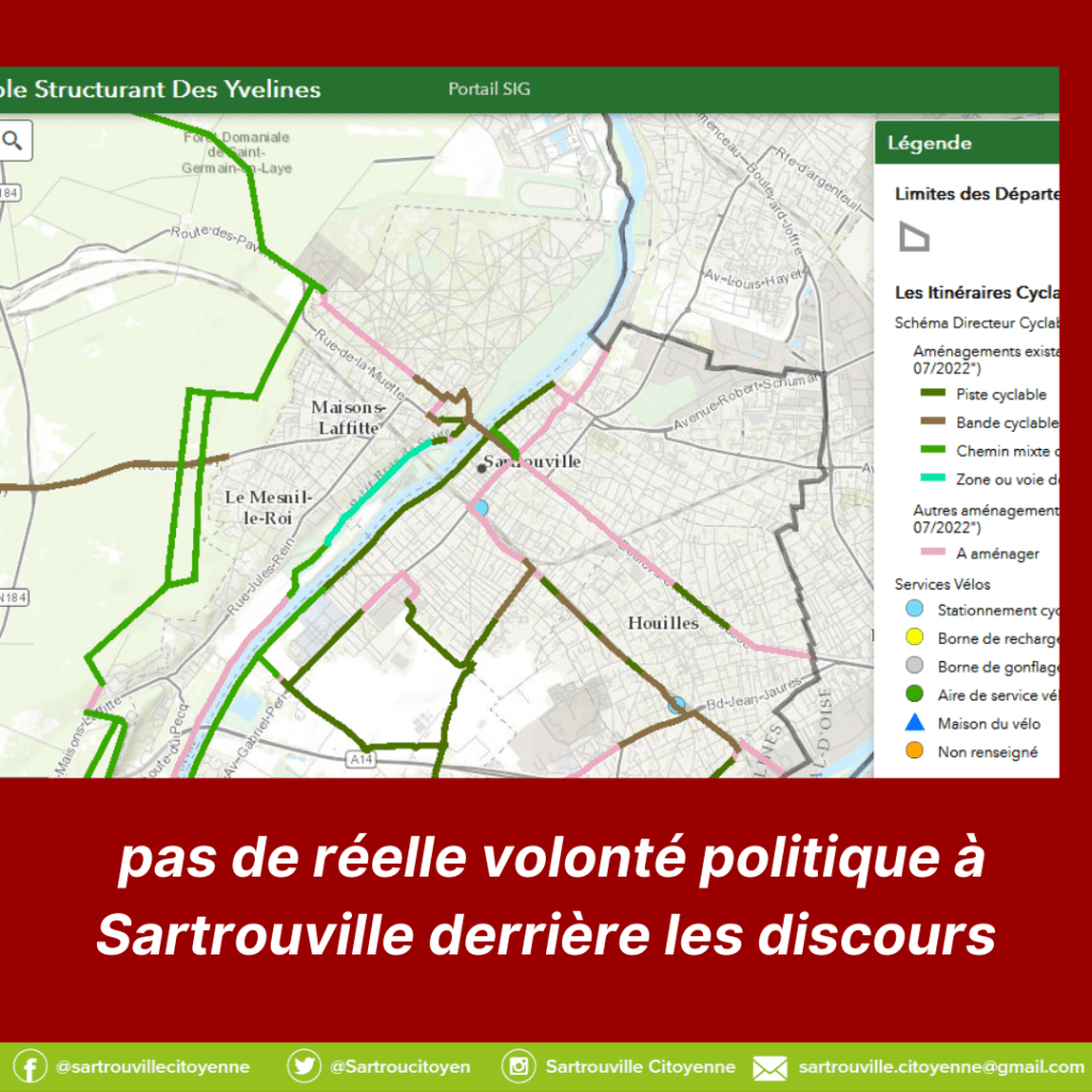 Pour développer le vélo à Sartrouville, il faut des aménagements. Faites des infrastructures de qualité et le vélo prendra le pas sur la voiture : des stationnements adaptés et en nombre suffisant, des voies vraiment sécurisées, des carrefours à 30 km/h, des trottoirs permettant aux piétons de circuler en sécurité etc.