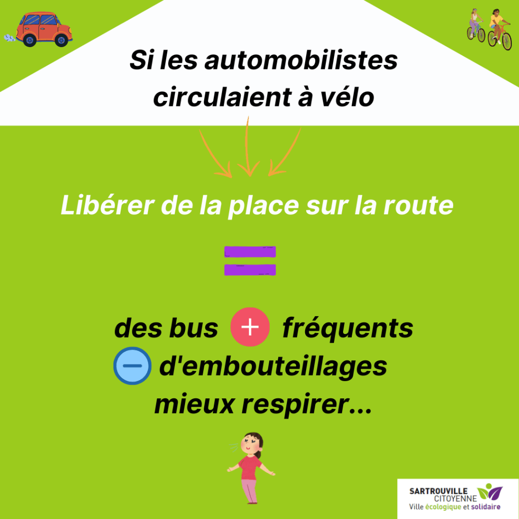 Si les automobilistes circulaient à vélo, cela libèrerait de la place sur la route = des bus plus fréquents, moins d’embouteillages, mieux respirer…