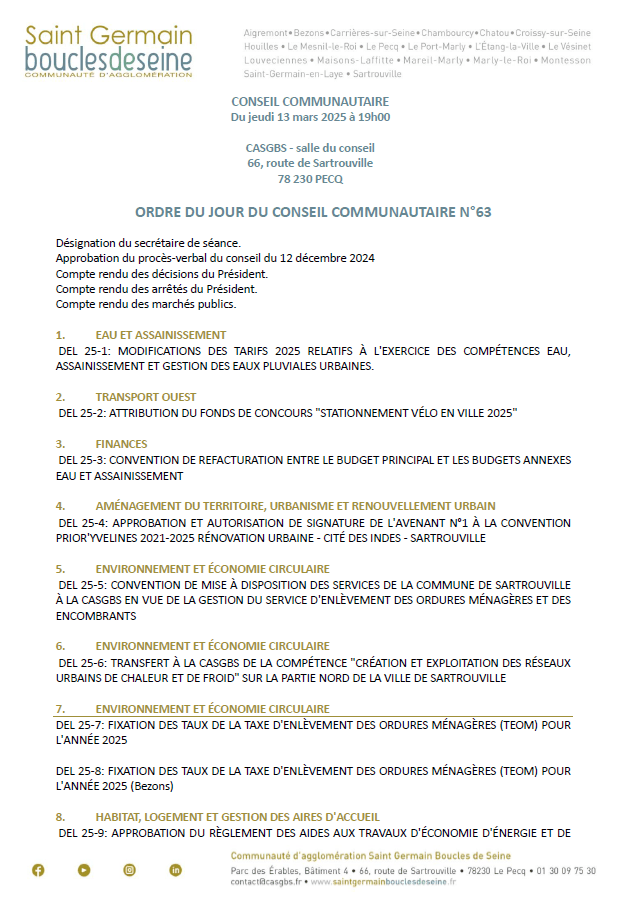 Le prochain conseil communautaire se tiendra le jeudi 13 mars à 19h00 , dans les locaux de la CASGBS au Pecq (Parc des Erables – 66 route de Sartrouville – Bât 4, 3ème étage – porte de gauche).