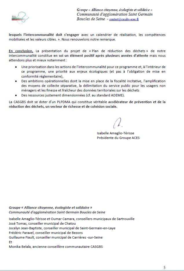 En conclusion, La présentation du projet de « Plan de réduction des déchets » de notre intercommunalité constitue en soi un élément positif après plusieurs années d’attente mais nous attendons plus et mieux notamment :