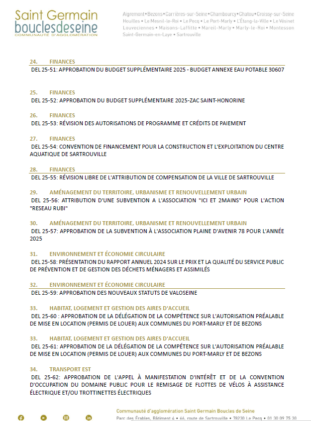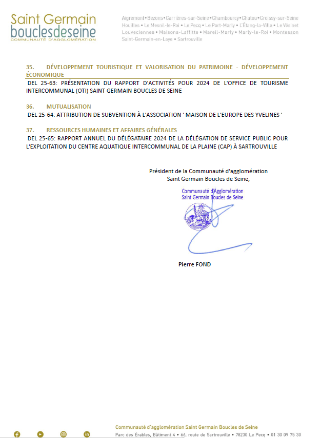• services publics délégués (=confiés au privé) : eau et assainissement, piscine, office de tourisme les rapports 2024 seront présentés à l’assemblée,