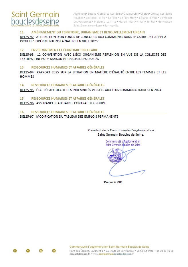 - conventions diverses : avec un éco-organisme pour la collecte de textile/linge/chaussures usagés, une refacturation pour le traitement de l’eau à Saint-Gerain-en-Laye, l’occupation d’une voie ONF à Maisons-Laffitte