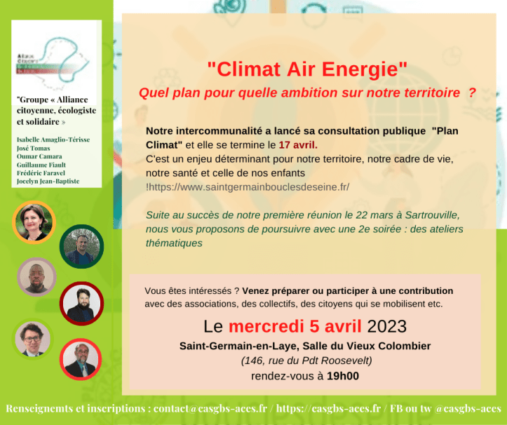 L’élaboration de ce Plan « Climat-Energie » (PCAET) se termine bientôt et vous pouvez donner votre avis par courriel, vous pouvez consulter les synthèses ou l’intégralité du dossier ou… nous questionner, ou venir à l’une de nos réunions pour échanger (+ d’informations ici : https://sartrouvillecitoyenne.fr). Ce document peut être un véritable accélérateur de la transition énergétique et il doit réfléter et planifier notre ambition écologique, climatique. Il y a urgence ! C’est l’engagement pour notre territoire en faveur d’une société sobre et responsable.