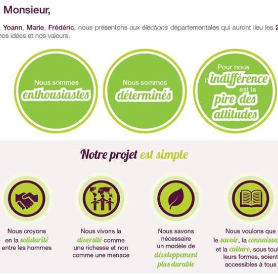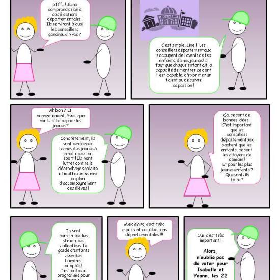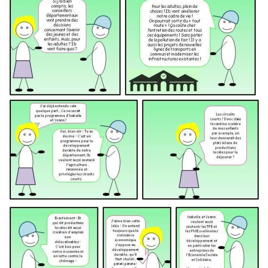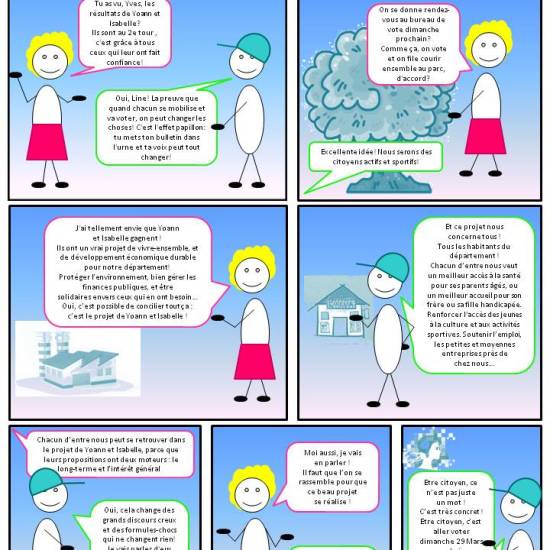 Conscient de la désaffection des citoyens pour cette élection, nous avons osé une campagne décalée, colorée misant sur le numérique en plus des actions de terrain. Nous avons, par exemple, réalisé une petite bande dessinée des aventures de « Yves et Line » que nous avons distribuée en nombre aux abords des gares mais aussi dans les marchés et à l’entrée des hypermarchés du secteur. L’accueil a été bon et nous invite à innover pour les prochaines campagnes.