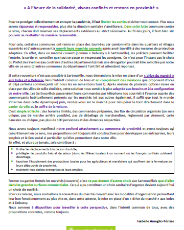 Notre lettre ouverte au Maire de Sartrouville pour les commerces et les marchés « A l’heure de la solidarité, vivons confinés et restons en proximité »